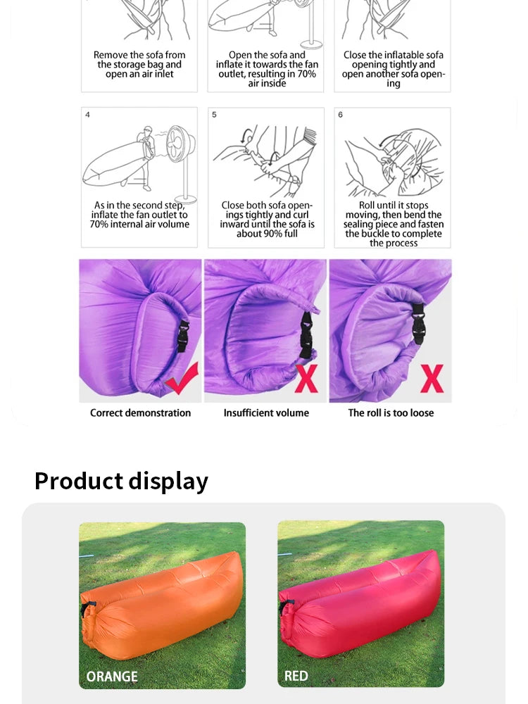 Open the sofa and run or swing it through the air to trap air. Roll the end tightly and clip the buckle to seal. Adjust for comfort and enjoy relaxation anywhere.